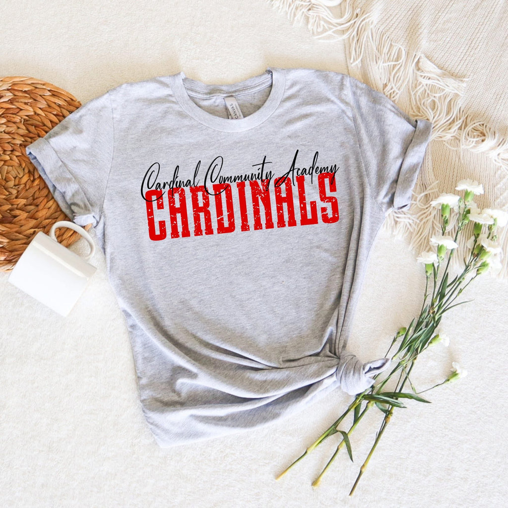 Show your Cardinal Pride! Unisex Gildan Ultra Cotton or similar brand Short Sleeve, Long Sleeve, Crewneck Sweatshirt or Hoodie options in Heather Athletic Grey, Red or Black. Hoodies/Crews will be Gildan or Jerzees brand depending on stock.